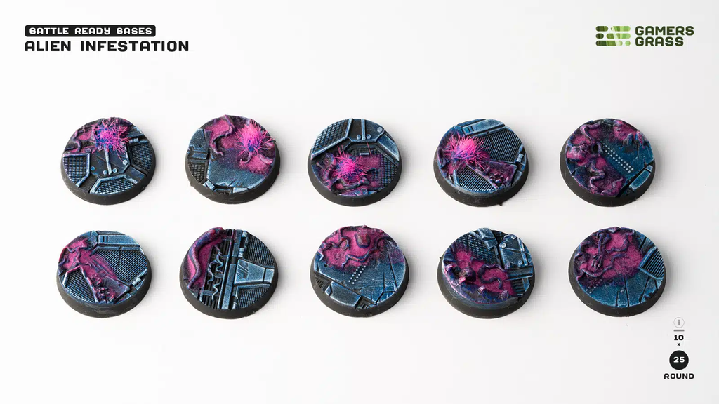 This blister contains 10 thermoplastic 25mm wide round Battle Ready Bases, in an Alien Infestation theme.