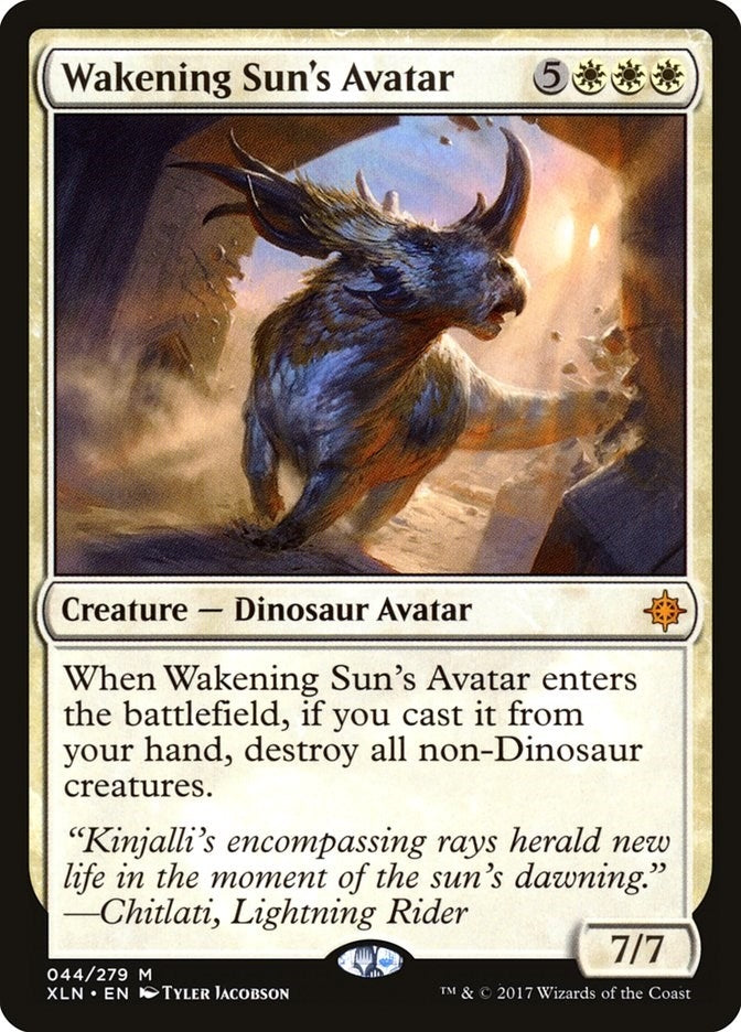 When Wakening Sun's Avatar enters the battlefield, if you cast it from your hand, destroy all non-Dinosaur creatures.