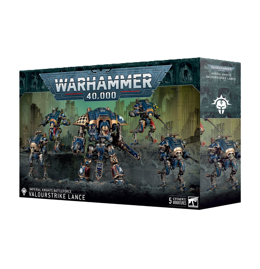 Imperial Knights are towering machines of death piloted by noble scions of chivalrous houses. This Valourstrike Lance contains a Knight Paladin (which can also be built as a Knight Errant) and four Armiger Helverins armed with a pair of devastating Armiger autocannons, which can alternatively be constructed as Armiger Warglaives wielding thermal spears and reaper chain-cleavers. This box also comes with an Imperial Knights Transfer sheet which features 647 decals.
