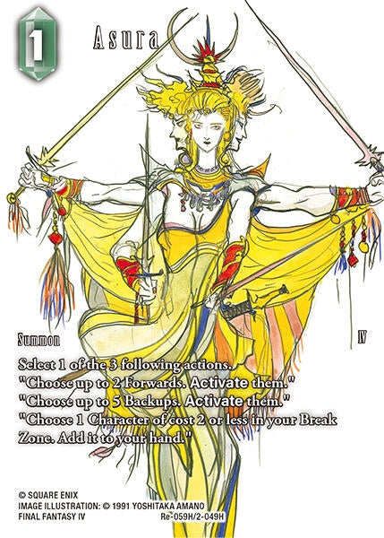 | Description: | Select 1 of the 3 following actions:  - "Choose up to 2 Forwards. Activate them." - "Choose up to 5 Backups. Activate them." - "Choose 1 Character card of cost 2 or less in your Break Zone. Add it to your hand."  |