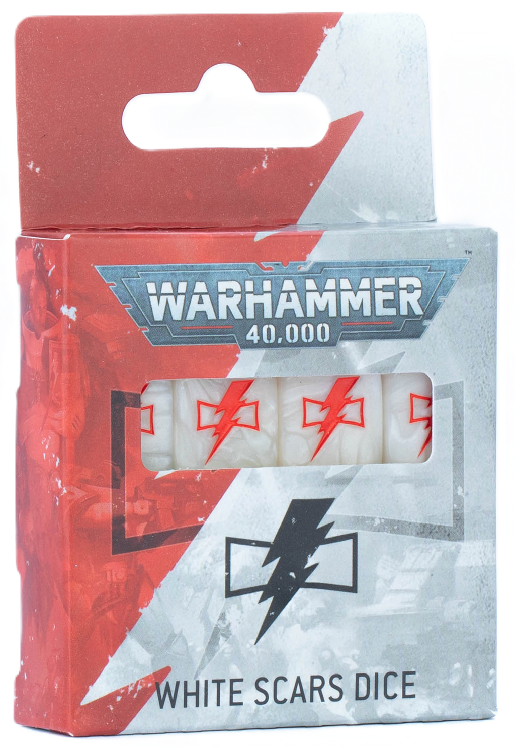 The White Scars dice are pearlised white dice with red pips and their faction icon on the six face. Contains 16 six sided dice