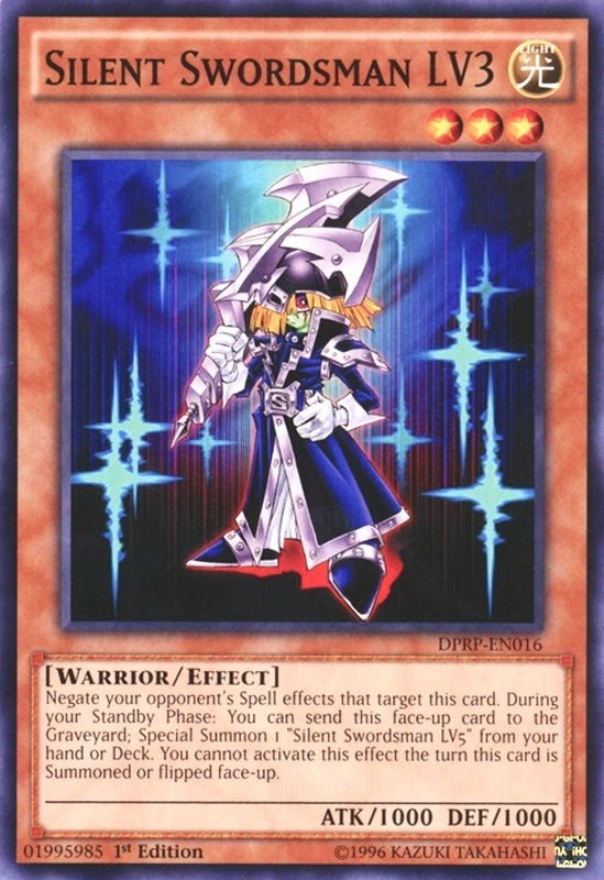 • Description: Negate your opponent's Spell effects that target this card. During your Standby Phase: You can send this face-up card to the Graveyard; Special Summon 1 "Silent Swordsman LV5" from your hand or Deck. You cannot activate this effect the turn this card is Summoned or flipped face-up.