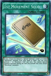 - Description: If you control no monsters: Special Summon 1 Level 4 or lower "Melodious" monster from your hand or Deck. You can only activate 1 "1st Movement Solo" per turn. You cannot Special Summon monsters during the turn you activate this card, except "Melodious" monsters.