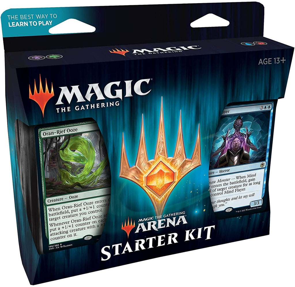 The 2021 Arena Starter Kit contains 2 ready-to-play 60 card decks—with 1 traditional foil Rare card and 4 nonfoil Rare cards, 2 deck storage boxes, 1 Rules and World-of-Magic booklet, and 1 twice-redeemable MTG Arena Code Card for two people to unlock both decks online at MTG Arena. Both decks include basic lands and feature cards from Magic: The Gathering’s Dungeons & Dragons, mage school, and Viking-themed sets—Adventures in the Forgotten Realms, Strixhaven: School of Mages, and Kaldheim. - UPC: 195166100043