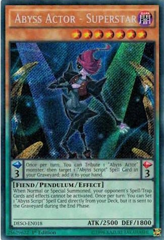 Pendulum Effect : Once per turn: You can Tribute 1 "Abyss Actor" monster, then target 1 "Abyss Script" Spell Card in your Graveyard; add it to your hand.