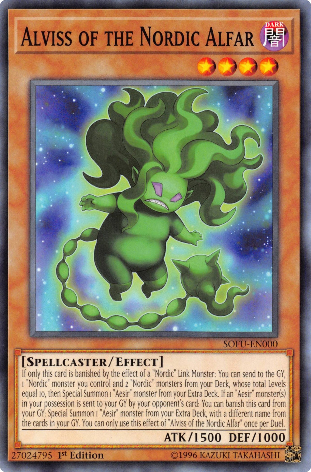 - Description: If only this card is banished by the effect of a “Nordic” Link Monster: You can send to the GY 1 “Nordic” monster you control and 2 “Nordic” monsters from your Deck whose total Levels equal 10, then Special Summon 1 “Aesir” monster from your Extra Deck. If an “Aesir” monster(s) in your possession is sent to your GY by your opponent’s card: You can banish this card from your GY; Special Summon 1 “Aesir” monster from your Extra Deck with a different name from the cards in your GY. You can only use this effect of “Alviss of the Nordic Alfar” once per Duel.